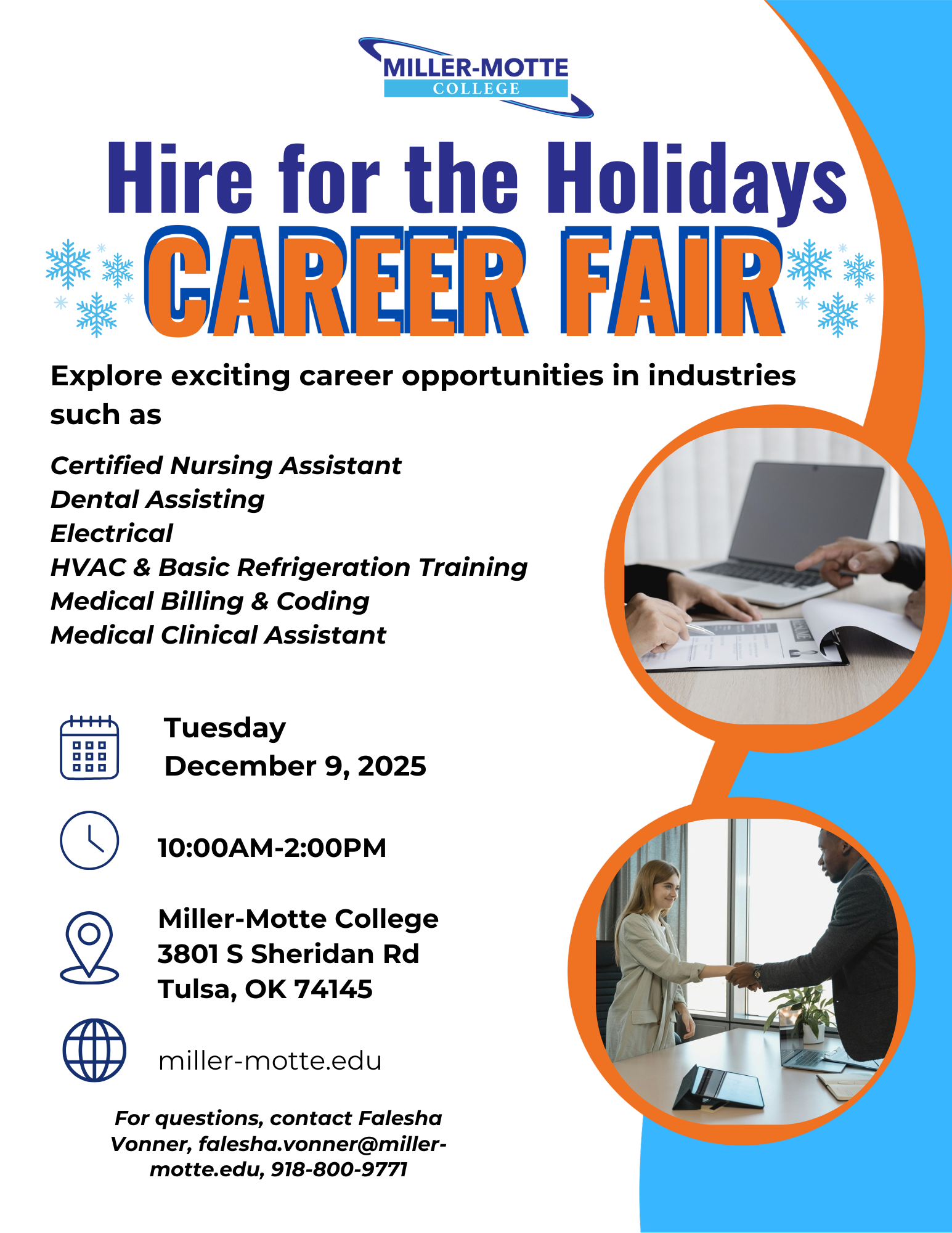 Join us at Miller-Motte College Tulsa for our Hire for the Holidays Career Fair—a chance to explore training opportunities and learn about in-demand careers in fields such as: