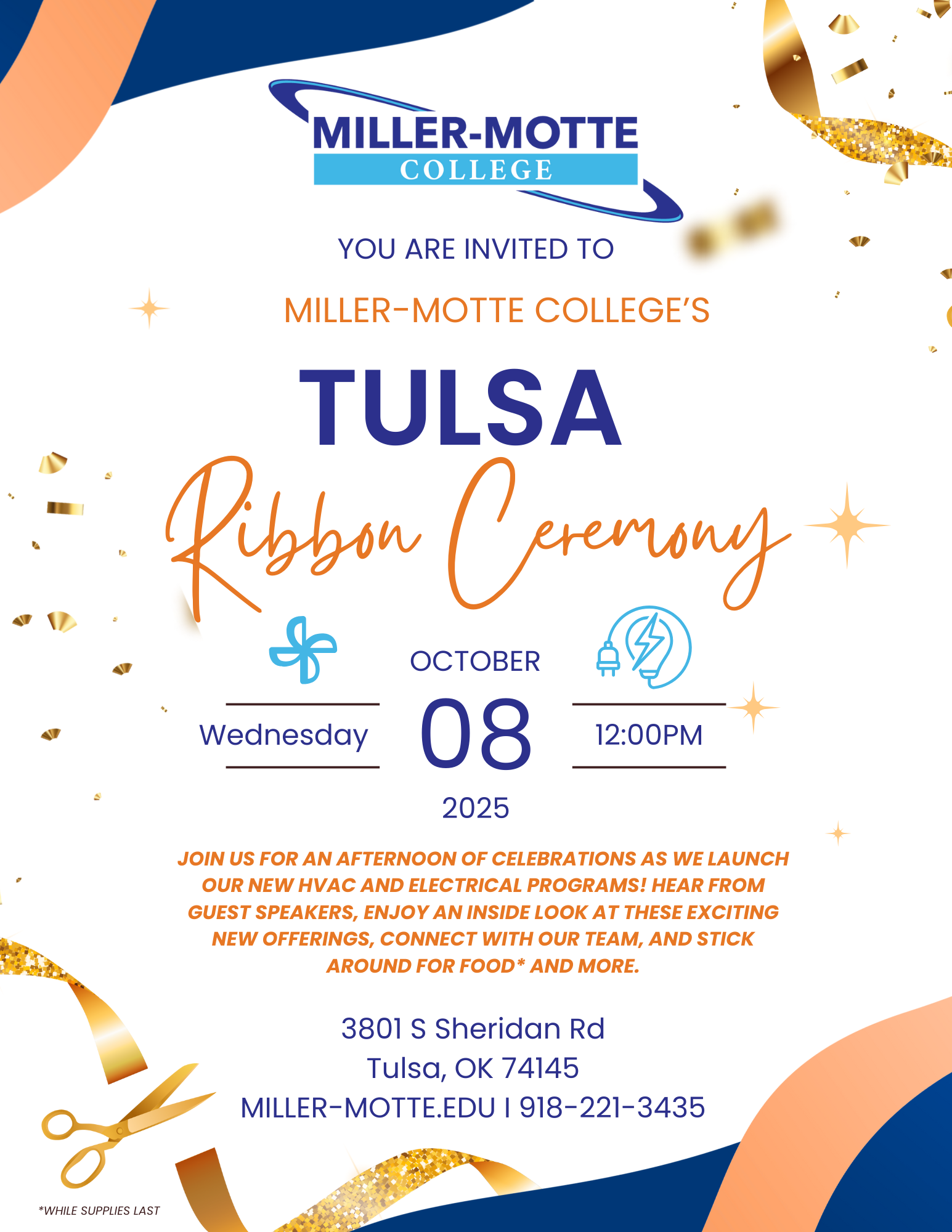 Join us at Miller-Motte College Tulsa for an afternoon of celebration as we officially launch our new HVAC and Electrical programs! This special ribbon-cutting ceremony will feature guest speakers, campus tours, and an inside look at how these programs are preparing students for success in high-demand career fields.
